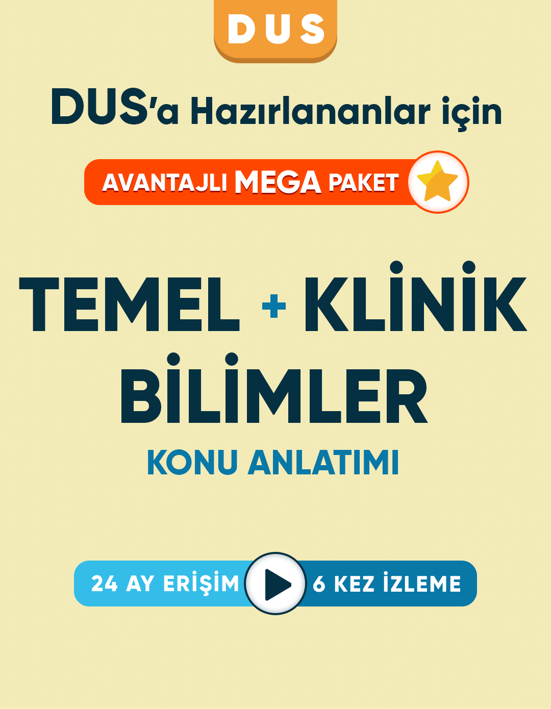 DUS MEGA Eğitim Seti, Temel + Klinik bilimlerin tamamını kapsayan, DUS’a 2 yıl boyunca sistemli ve derinlemesine hazırlanmak isteyenler için tasarlandı. 24 ay erişim ve 6 izleme hakkı ile dersaneye gitmeden DUS’a eksiksiz hazırlık!